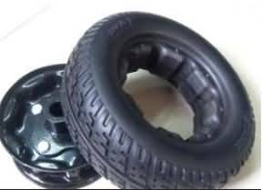 微孔聚氨酯彈性體輪胎是一種不必充氣的免充氣輪胎,是采用微閉孔發泡技術將高分子聚合材料形成互不相通而又致密的微小氣室,內部充滿高彈性海綿體狀的輪胎。